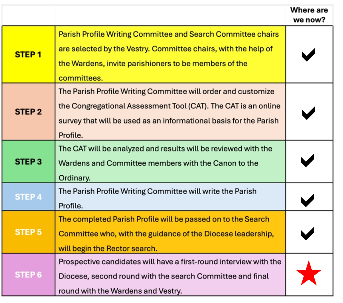 Thanks to all of you for your commitment to completing the CAT and participating in our many listening sessions, the Parish Profile committee was able to articulate our identity and what we are looking for in our next Rector in the form of the Parish Profile. Steven Wilco, Interim Canon to the Ordinary of the Diocese of Western Massachusetts has the profile and will begin next steps in the search process. The Search Committee, headed by Marilyn Benoit, will be working closely with Steven to review candidates and set up interviews.